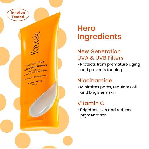 Vitamin C is a well-known antioxidant that helps improve skin radiance and protect against environmental stressors. Foxtale Glow Sunscreen is enriched with Vitamin C to help brighten dull skin, support collagen health, and fight free radical damage caused by sun exposure and pollution.