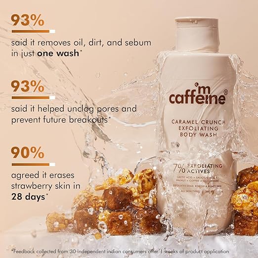 mCaffeine 7% Exfoliating Body Wash 300ml | 1% Salicylic & 2% Lactic Acid | Winter Bodywash for Dry Skin| Reduces Body Acne, Strawberry Skin & Ingrown Hair | Smooth and Hydrated Skin